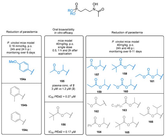 - Kurz, T.; Schlüter, K.; Kaula, U.; Bergmann, B.; Walter, R.D.; Geffken, D. Synthesis and Antimalarial Activity of Chain Substituted Pivaloyloxymethyl Ester Analogues of Fosmidomycin and FR900098. Bioorg. Med. Chem. 2006, 14, 5121–5135. [Google Scholar] [CrossRef] [PubMed]