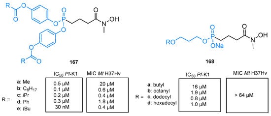 - Courtens, C.; Risseeuw, M.; Caljon, G.; Maes, L.; Cos, P.; Martin, A.; Van Calenbergh, S. Double Prodrugs of a Fosmidomycin Surrogate as Antimalarial and Antitubercular Agents. Bioorg. Med. Chem. Lett. 2019, 29, 1232–1235. [Google Scholar] [CrossRef] [PubMed]