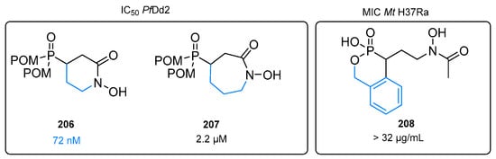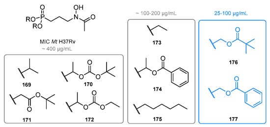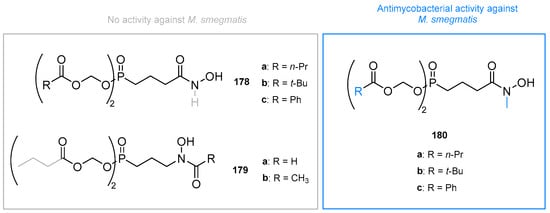 Andaloussi et al. developed the N-hydroxypyridone 9 (Figure 10) as an MBG [104], which only showed very weak MtDXR enzyme inhibition with an IC50 value of 53 µM and no in vitro growth inhibition of Mt [104].