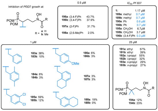 - Behrendt, C.T.; Kunfermann, A.; Illarionova, V.; Matheeussen, A.; Gräwert, T.; Groll, M.; Rohdich, F.; Bacher, A.; Eisenreich, W.; Fischer, M.; et al. Synthesis and Antiplasmodial Activity of Highly Active Reverse Analogues of the Antimalarial Drug Candidate Fosmidomycin. ChemMedChem 2010, 5, 1673–1676. [Google Scholar] [CrossRef] [PubMed]