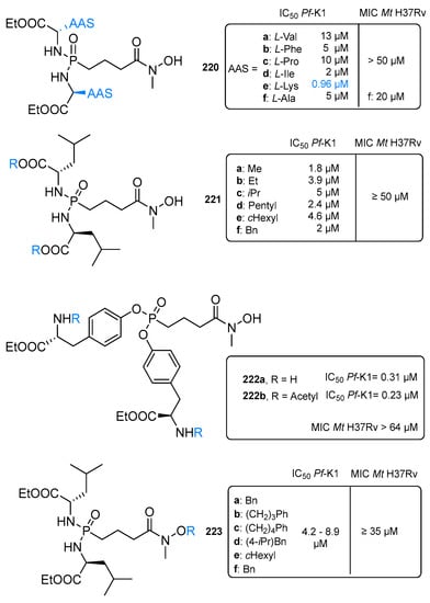 - Courtens, C.; Risseeuw, M.; Caljon, G.; Maes, L.; Martin, A.; Van Calenbergh, S. Amino Acid Based Prodrugs of a Fosmidomycin Surrogate as Antimalarial and Antitubercular Agents. Bioorg. Med. Chem. 2019, 27, 729–747. [Google Scholar] [CrossRef] [PubMed]