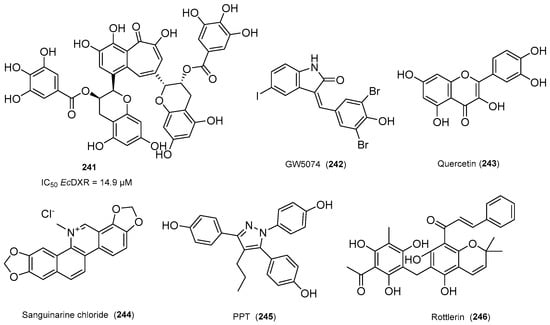 - Zinglé, C.; Tritsch, D.; Grosdemange-Billiard, C.; Rohmer, M. Catechol-Rhodanine Derivatives: Specific and Promiscuous Inhibitors of Escherichia coli Deoxyxylulose Phosphate Reductoisomerase (DXR). Bioorg. Med. Chem. 2014, 22, 3713–3719. [Google Scholar] [CrossRef]