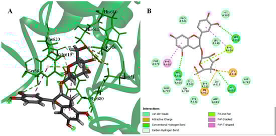 Epicatechin 3-O-β-D-glucopyranoside exhibits the highest binding affinity with binding energy −23.6583 kcal/mol (RSMD = 1.70) (Figure 1). The interaction of compounds with the active receptor site is mainly supported by hydrogen bonds and hydrophobic interactions. The interactions are formed by hydrogen bonding with His 610 and His 611 and metal binding with zinc 901 atoms which further form ionic interactions with Asp 649, Asp 742, and His 651, together with hydrophobic interactions with significant distance between the boundary of the active site (Figure 1).