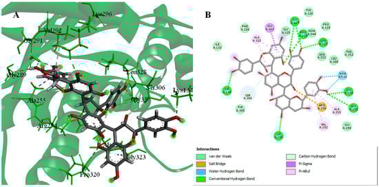 3D (A) and 2D (B) interactions complex of procyanidin C2 with PDK3 (PDB ID: 1Y8O).