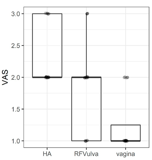The visual analog scale (VAS) to evaluate analgesic effects of various therapies. The middle line of the boxplot is median, the lower and upper hinges correspond to the first and third quartiles (the 25th and 75th percentiles). The upper whisker extends from the hinge to the largest value (no further than 1.5*IQR from the hinge, IQR is the interquartile range—distance between the first and third quartiles). The lower whisker extends from the hinge to the smallest value (no further than 1.5*IQR of the hinge). Median line overlaps with lower and upper hinges.