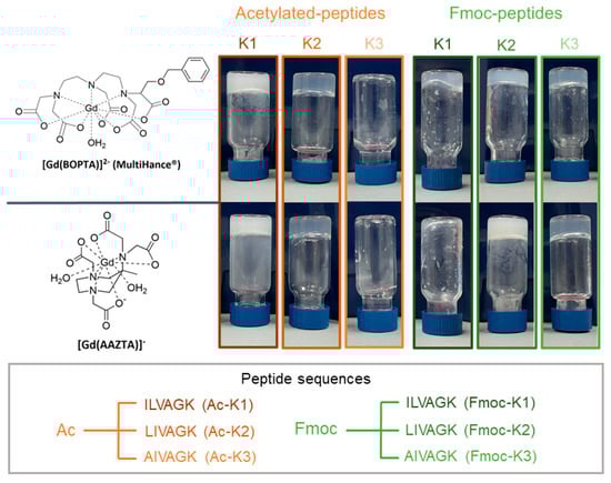 Schematic representation of peptide sequences according to the one code letter practice and of Gd(III) complexes ([Gd(BOPTA)]2−) and [Gd(AAZTA)]− used for hydrogel formulations. For each combination, being peptide–Gd(III) chelates, the inverted test tube is also reported.