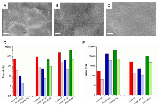 Further structural characterization of paramagnetic hydrogels was assessed by Fourier transmission infrared (FTIR) and scanning electron microscopy (SEM) techniques. Selected FTIR spectra of Gd complexes loaded into hydrogels and of the corresponding empty ones are reported in Figure S5. From the inspection of the spectra, a common transmittance profile can be observed for all the examined samples. In detail, IR profiles are dominated by two main signals, typically observed in the case of aggregates rich in β-sheet structures. The first very broad signal is detectable in the amide A region (~3500–3300 cm−1) and the second one in the amide I region (1700 to 1600 cm−1). More precisely, the band around 3395 cm−1 is originated by the NH stretching vibrations polarized along the N-H bond and by the O-H stretching occurring between the hydrogel matrix and the surrounding water. The high intensity of this band is indicative of the extended network of inter- and intramolecular hydrogen bonds existing in the supramolecular structure. On the other hand, the band around 1650 cm−1 is due to the C=O stretching vibration and used to confirm the presence of β-sheet structures. Micrographs of selected samples (Fmoc-K1, Fmoc-K2 and Fmoc-K3 encapsulating [Gd(BOPTA)]2−) are reported in Figure 2A–C. SEM images of the xerogels show fibrillary interconnected networks, typically observed for peptide-based hydrogels. By comparison with the corresponding empty hydrogels, it can be concluded that the insertion of the metal complex does not affect the overall morphology. Similar results were obtained also for Fmoc-peptide-based hydrogels encapsulating [Gd(AAZTA)]− and [Gd(DTPA]2− (see Figure S6) and for Ac-peptide HGs encapsulating the same complexes. A rheological analysis was carried out to assess the effect of Gd(III) complexes physical entrapment on the mechanical properties of the final matrix. A rotational controlled stress rheometer was used, and the experiments were carried out in the linear viscoelastic region after a preliminary parameter evaluation.