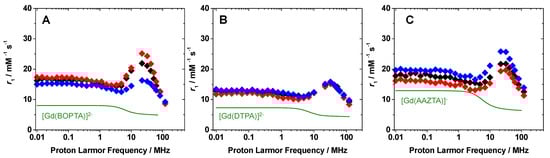 1H NMRD profiles of Fmoc-K2+[Gd(BOPTA)]2− (A), Fmoc-K2+[Gd(DTPA)]2− (B) and Fmoc-K2+[Gd(AAZTA)]− (C) at 283 (blue), 298 (black) and 310 K (red). The profiles of the corresponding chelates in aqueous solution are also reported as solid lines.