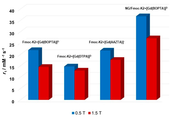 Comparison of the r1 values calculated at 0.5 and 1.5 T (298 K) for Fmoc-K2+[Gd(BOPTA)]2−, Fmoc-K2+[Gd(DTPA)]2−, Fmoc-K2+[Gd(AAZTA)]− and NG/Fmoc-K2+[Gd(BOPTA)]2−. Relaxometric measurements are not in triplicate.