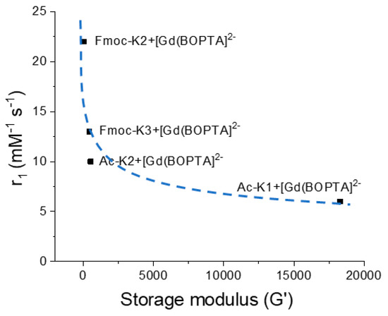 Dependence of r1 values (20 MHz and 298 K) on the storage modulus (G′) of hydrogels based on [Gd(BOPTA)]2−.