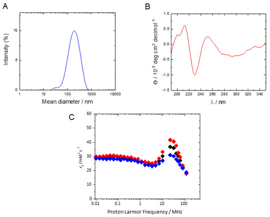 Structural and relaxometric characterization of Fmoc-K2 NG loaded with [Gd(BOPTA)]2−. (A) CD profile of the NG solution recorded in the range between 350 and 190 nm; (B) Dynamic light scattering profile and the paramagnetic NG; (C) 1H NMRD profile of the nanogel at 283 (blue), 298 (black) and 310 K (red).