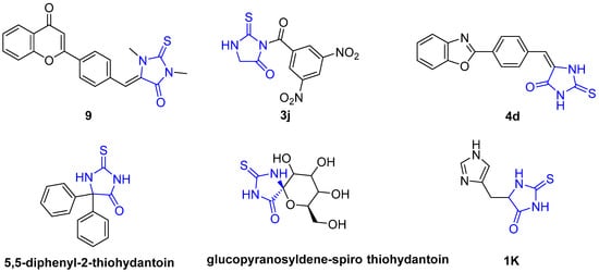 - Mezoughi, A.B.; Mohammed, W.A.; Ettarhouni, Z.O. Recent Biological Applications and Chemical Synthesis of Thiohydantoins. J. Chem. Rev. 2021, 3, 196–218. [Google Scholar] [CrossRef]