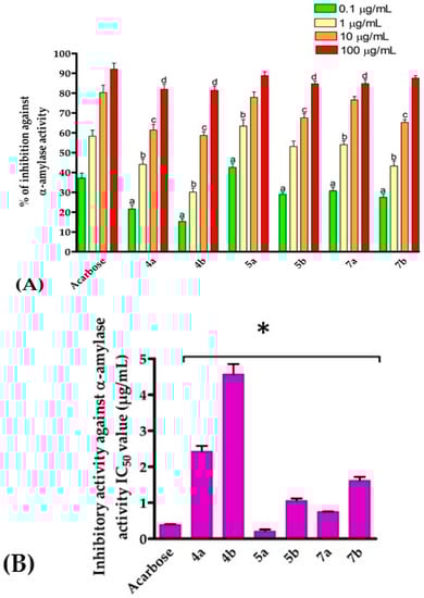 | α-amylase (4gqr) | 5a | −10.34 | Tyr62 Arg195 Asp300 | 2.33 3.57 2.13 | Trp58, Trp59, Leu162, Leu165, Ala198, Ile235 |
