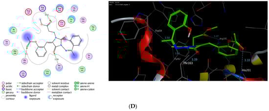 | 7a | −11.69 | Trp59 Tyr62 Thr163 Arg195 His201 | 3.50 3.63 3.39 3.37 3.10 | Trp58, Trp59, Leu162, Leu165, Ala198, Ile235 |