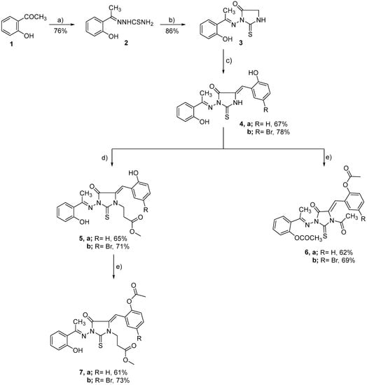 3.2.3. General Procedure for the Synthesis of Methyl [5-arylidnene-4-oxo-3-(2-hydroxyphenyl ethylidene) amino-2-thioxoimidazolidin-1-yl] propionates (5a–b)