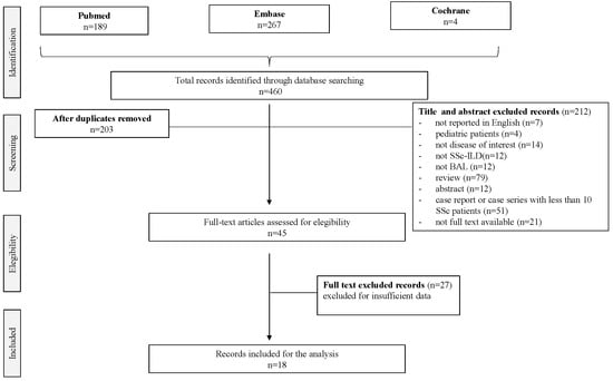 The initial search retrieved 331 results from MEDLINE, 127 from PubMed, 200 from Embase, and 4 from Cochrane Collection. Aiming to select the most relevant articles and of the highest quality, we included peer-reviewed publications in English, with population-based studies that reported an association between BAL and SSc-ILD, while case reports, reviews, congress abstracts, letters to the editor, or editorials were excluded, as well as case series with less than 10 SSc patients. In Figure 1, the flowchart with details on the included and excluded manuscripts is shown. First-stage screening by reviewing titles and abstracts excluded 212 publications, while 45 articles were identified for the second-stage screening through full-text analysis. Eventually, 18 articles met all the inclusion criteria and constituted the final pool of this SLR (Figure 1) [,,,,,,,,,,,,,,,,,].