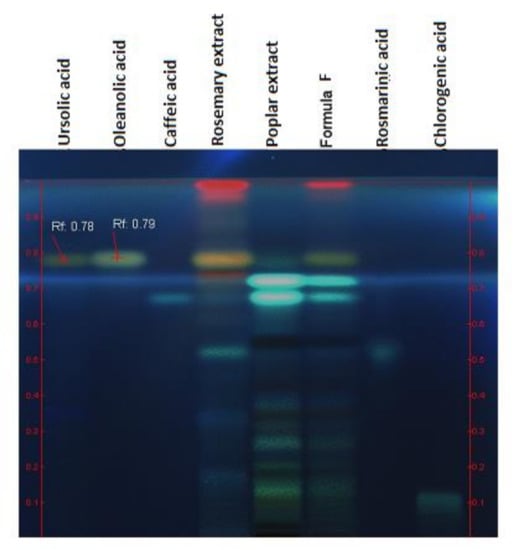 HPTLC analysis aimed to highlight the marker compounds in the final formula in comparison with its component extracts. Figure 1 reveals the presence of salicin in the formula and poplar extract. Shown in the second figure (Figure 2), triterpenic (ursolic and oleanolic) and polyphenolcarboxylic (chlorogenic and caffeic) acids were identified in the formula.