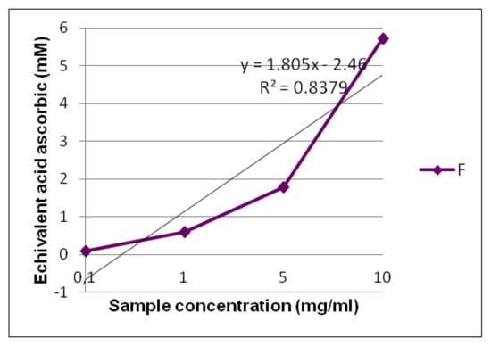 Total antioxidant capacity was performed by the phosphomolybdic acid method based on the reduction of Mo (VI) to Mo (V) by a compound with antioxidant potential with the formation of a green phosphate/Mo (V) complex having maximum absorption at 695 nm. The method is used successfully to quantify vitamin E and it has been extended to determine the antioxidant capacities of plant extracts. It is a quantitative method, since the antioxidant activity is expressed as a number of ascorbic acid equivalents. Formula F exerts an antioxidant effect of, at maximum, 5.72 mM equivalent ascorbic acid at a concentration of 10 mg/mL, which decreases to 0.6 mM equivalent ascorbic acid at 1 mg/mL (Figure 4).