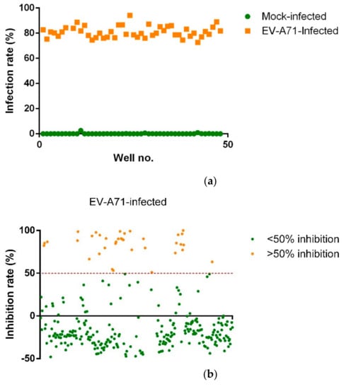 (a) The scatterplot represents the infection rates of individual wells, either EV-A71 infected or mock-infected. Z-factor, measured at 0.818, was indicative of a highly robust screening platform for high-throughput screening. (b) The scatterplot represents the inhibition rates of all compounds screened on EV-A71-infected RD cells with 36 compounds found to have >50% inhibition.
