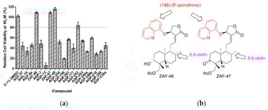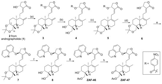 As shown in Scheme 1, intermediate 2 was prepared according to the reported references [44,45] by starting from andrographolide (1), and then the synthetic process from 2 to the 8,9-olifen 6 was adopted from our recently published method [46]. Briefly, acylation of 2 at 14-OH by p-nitrobenzoyl chloride provided compound 3, the olefin migration step of 8,17-olefin (3) to 8,9-olefin (4) was conducted by the treatment of 85% H3PO4 followed by 3,19-protection of 4 by 2,2-dimethoxypropane and PPTS yielded 3,19-acetonylidene 5, de-acetylation at 14-position of 5 in methanol by Lithium carbonate afforded the key intermediate 6. After Mitsunobu reaction of 6 at 14-position was conducted to give 7, de-protection of 3,19-acetonylidene by p-TSA in methanol obtained diol 8, selectively acetylation by acetyl chloride of primary alcohol of 19-position afforded ZAF-46 and oxidation by DMP of 3-alcohol to 3-ketone produced ZAF-47.