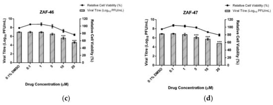 Firstly, we performed cell viability assay to evaluate the cytotoxicity profile of the 19 hits. Cells seeded overnight were treated with the hit compounds at 10 µM. Out of the 19 hits, 4 hits showed cell viability higher than 80% (Figure 2a). Anti-EV-A71 activity of AGP-253 had been illustrated and discussed previously [43]. We were particularly interested in ZAF-46 and ZAF-47 as they belonged to the same series bearing novel 14-quinolinoxy and 17-hydro-8,9-olefin modifications (Figure 2b) that could potentially open up new targets for EV-A71 therapeutics. Additional cell viability assays were performed for ZAF-46 and ZAF-47 at different concentrations to identify the low cytotoxic concentrations for downstream post-treatment assays. For post-treatment assays, cells seeded overnight were infected with EV-A71 and subsequently treated with ZAF-46 and ZAF-47 at different concentrations. We found that treatment with either ZAF-46 or ZAF-47 led to a significant dose-dependent reduction in viral titres. Treatment with ZAF-46 led to 1.4 log reduction at 10 µM and 2.4 log reduction at 20 µM (Figure 2c) while treatment with ZAF-47 led to 0.8 log reduction at 5 µM, 1.1 log reduction at 10 µM and 2.1 log reduction at 20 µM (Figure 2d). CC50 and IC50 for both compounds were determined and used to derive their SI (Table 2). ZAF-47 was selected for further downstream analysis due to its higher SI value which indicate higher pharmacological value for clinical use.