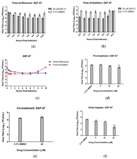 ZAF-47 acts EV-A71 post-entry stages. (a) TOA and (b) TOR assays were performed with either 20 µM ZAF-47 or 0.1% DMSO at pre-determined timepoints. (c) Combined graphs from both assays suggest that ZAF-47 acts between 4 and 6 hpi. (d) Pre-treatment assay showed only significant difference in viral titre with the control at the highest concentration used suggests that ZAF-47 is unlikely to inhibit viral entry by binding to host receptors. (e) Co-treatment assay displayed no significant difference between control and ZAF-47-treated suggests that ZAF-47 is unlikely to inhibit viral entry by binding to viral surface proteins. (f) Entry bypass assay displayed significant dose-dependent viral titre reduction suggests that ZAF-47 possibly targets EV-A71 post-entry stages. Triplicates were performed with error bars plotted to show the mean and standard deviation. Data were evaluated with one-way ANOVA and Dunnett’s test for statistical significance. ** signifies p < 0.01 and *** signifies p < 0.001.