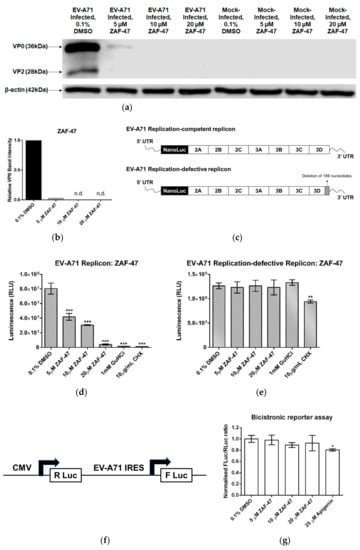 Since ZAF-47 possibly targets EV-A71 post-entry stages, we were interested in looking at the effect of ZAF-47 on EV-A71 protein expression. To do so, we first infected RD cells with EV-A71. We then treated the infected cells with different concentration of ZAF-47 for 6 h and collected the cell lysates for SDE-PAGE and Western blot. Analysed with the vehicle control, we found that treatment with ZAF-47 resulted in significant drop in band intensities of EV-A71 proteins, VP2 (28 kDa) and VP0 (36 kDa). VP2 band could been seen with the vehicle control but not with any ZAF-47 treatment while VP0 band could be seen with ZAF-47 treatment at 5 µM but the intensity was reduced by 35-fold in comparison to the control (Figure 4a,b) after normalization with the detected loading control, β-actin. These observations showed that treatment with ZAF-47 can reduce EV-A71 protein expression in host cells. Since ZAF-47 acts on the post-entry stages and reduces EV-A71 protein expression, we hypothesized that ZAF-47 could be inhibiting RNA replication or protein translation, or possibly both, resulting in reduced viral protein expression.