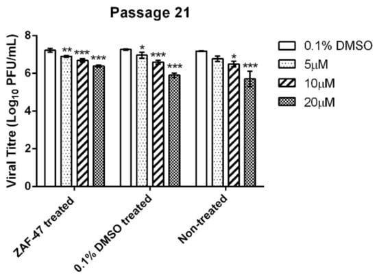 Post-treatment assay using EV-A71 passaged 21 times in RD cells in the presence of ZAF-47. Treatment with ZAF-47 led to significant viral titre reductions. This suggests that the passaged virus has not develop any resistance. Triplicates were performed with error bars plotted to show the mean and standard deviation. Data were evaluated with one-way ANOVA and Dunnett’s test for statistical significance. * signifies p < 0.05, ** signifies p < 0.01 and *** signifies p < 0.001.