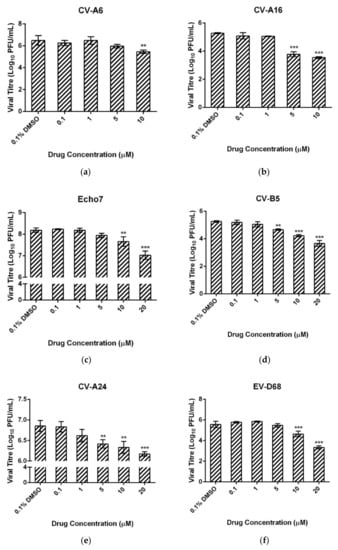 We were also interested in the antiviral potential of ZAF-47 against other Enteroviruses. As such, we performed post-treatment assay on RD cells infected with other Enteroviruses such as CV-A16, CV-A6, Echo7, CV-B5, CV-A24 and EV-D68. ZAF-47, at 10 µM, was capable in reducing the viral titres of the above-listed enteroviruses significantly (Figure 6a–f). The respective IC50 values upon ZAF-47 treatment for the different enteroviruses were tabulated in Table 3. The effectiveness of ZAF-47 against at least four different species of Enterovirus suggests that it can function as a broad-spectrum anti-enterovirus agent which is highly useful against HFMD, a common disease caused by different enteroviruses.
