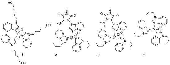 The structural formulas of tris(1H-indol-3-yl)methylium derivatives represent two groups of compounds, namely, derivatives with maleimide fragment (2,3) and derivatives without maleimide fragment in their structure (1,4), as shown in Figure 1. The chemical synthesis of all the compounds has been described previously: tris(1-(5-Hydroxypentyl)-1H-indol-3-yl) methylium chloride (1) [17]; (1-(4-Amino-2,5-dioxo-2,5-dihydro-1H-pyrrol-3-yl)-1H-indol-3-yl)bis(1-propyl-1H-indol-3-yl) methylium chloride (2) [20]; 1-(4-Dimethylamino-2,5-dioxo-2,5-dihydro-1H-pyrrol-3-yl) -1H-indol-3-yl) bis(1-propyl-1H-indol-3-yl) methylium chloride (3) [20]; and tris(1-propyl-1H-indol-3-yl) methylium chloride (4) [15].