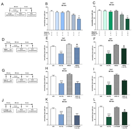 The antidepressant-like effects of (S)-ketamine (blue panel) and (R)-ketamine (green panel) coadministered with LY341495 in the TST. (A) schedule of experiments B and C; (B) the antidepressant-like effects of (S)-ketamine coadministered with LY341495; (C) the antidepressant-like effects of (R)-ketamine coadministered with LY341495; (D) schedule of experiments E and F; (E) influence of NBQX on the antidepressant-like effect of the mix SL; (F) influence of NBQX on the antidepressant-like effect of the mix RL; (G) schedule of experiments H and I; (H) influence of ANA-12 on the antidepressant-like effect of the mix SL; (I) influence of ANA-12 on the antidepressant-like effect of the mix RL; (J) schedule of experiments K and L; (K) influence of LY379268 on the antidepressant-like effect of the mix SL; (L) influence of LY379268 on the antidepressant-like effect of the mix RL. The values are expressed as the means ± SEM and were analyzed by two-way ANOVA. * p < 0.05, ** p < 0.01 drug × drug interaction; **** p < 0.0001 mix SL or mix RL main effect; @ p < 0.05 drug × drug interaction (N = 8–9). Mix SL—(S)-ketamine 1 mg/kg + LY 341495 0.1 mg/kg; mix RL—(R)-ketamine 1 mg/kg + LY 341495 0.1 mg/kg.