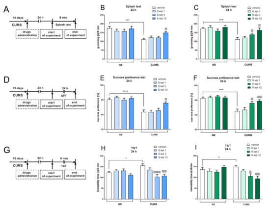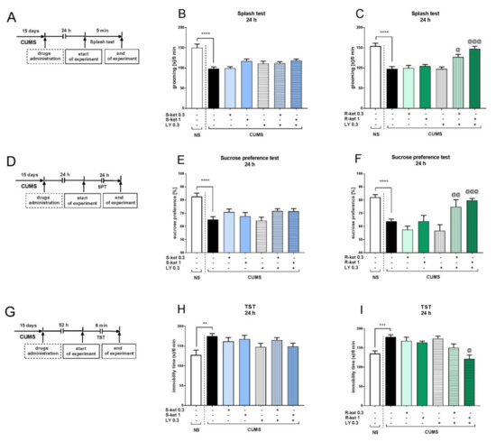 The antidepressant-like effects of (S)-ketamine (blue panel) and (R)-ketamine (green panel) in the CUMS model of depression. (A) schedule of experiments B and C; (B) (S)-ketamine effect in the splash test; (C) (R)-ketamine effect in the splash test; (D) schedule of experiments E and F; (E) (S)-ketamine effect in the sucrose preference test; (F) (R)-ketamine effect in the sucrose preference test; (G) schedule of experiments H and I; (H) (S)-ketamine effect in the TST; (I) (R)-ketamine effect in the TST. The values are expressed as the means ± SEM and were analyzed by two-way ANOVA. @ p < 0.05, @@ p < 0.01, @@@ p < 0.001 CUMS × drug interaction; * p < 0.05, *** p < 0.001, **** p < 0.0001 (CUMS effect, t-test) (N = 10–12).