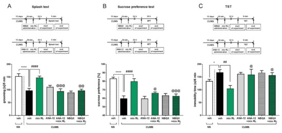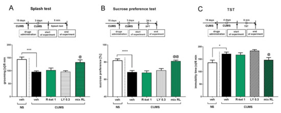 On the 15th day after the beginning of the CUMS procedure, the tested compounds ((S)-ketamine, (R)-ketamine and LY341495) were given separately or jointly at 7:00. NBQX (10 mg/kg) or ANA-12 (0.5 mg/kg) was administered 10 min and 30 min, respectively, before the mixtures of (R)- or (S)-ketamine and LY341495. Twenty-four hours after treatment, the splash test (see Section 4.5) was performed (starting at 7:00), followed by the sucrose preference test (SPT (see Section 4.6), starting at 9:00). Two hours after the end of the SPT, the TST was performed (see Section 4.3), and three hours later, the animals were sacrificed by rapid decapitation, trunk blood was collected and brain structures (PFC and hippocampus) were dissected and frozen at −80 °C. The same schedule of behavioral tests was used 72 h after drug administration. The control animals (NS) were tested with the same schedule as the CUMS animals.
