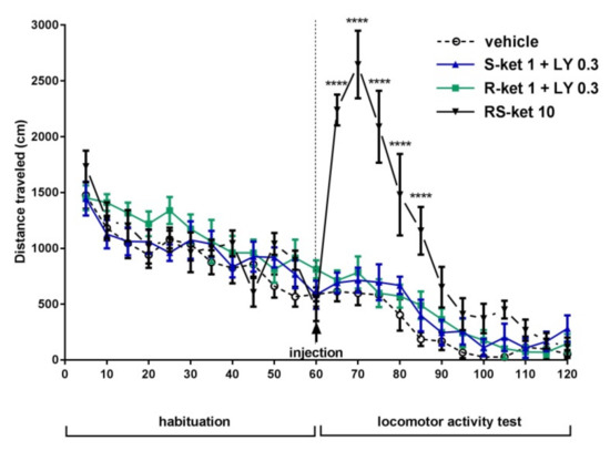 The effects of (S)-ketamine and (R)-ketamine coadministered with LY341495 on the locomotor activity of mice. The values are expressed as the means ± SEM and were analyzed by repeated-measures ANOVA. **** p < 0.0001 vs. vehicle (N = 8).