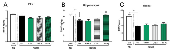 Based on CUMS results, we investigated BDNF levels in brain structures potentially associated with antidepressant activity (PFC and hippocampus), as well as in the plasma of mice previously subjected to the CUMS procedure [22]. In the PFC, we did not observe any differences in BDNF levels in non-stressed and CUMS mice, and furthermore, no changes in BDNF levels were induced by any of the drugs tested. In contrast, CUMS mice were found to have significantly lower BDNF levels in the hippocampus than control mice, and the combination of (R)-ketamine and LY341495 reversed these effects, which may indicate a relationship between BDNF levels in the hippocampus and therapeutic effects.