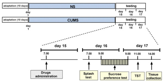 The CUMS procedure was performed as previously described, with the necessary modifications [43]. The experimental scheme is presented in Figure 8. The animals were divided into two groups: control mice (unstressed, designated NS) and mice subjected to CUMS. NS mice and CUMS mice were kept in separate rooms. After 10 days of adaptation to room conditions, during which all animals were handled and weighed, the CUMS procedure was started. The following stressors were used: restraint stress (30–60 min), cage tilting (45°; 4–12 h), predator smell (rat) (15 min–4 h), wet bedding (3–6 h), removal of sawdust (2–4 h), placing a mouse in the cage of another mouse (1–2 h), reversed light-dark cycle (48 h), substitution of sawdust with 37 °C water (60–90 min), placing 3 individuals in an empty cage (30–60 min), placing 3 individuals in a cage with 37 °C water (60–90 min) and overcrowding (18 individuals; 60 min). Two or three stressors were used daily, depending on their duration. Some stressors were used at night (tilted cage, inverted day/night cycle). A break of at least two hours between stressors was used. The stressors began at different times of the day between 7:00 and 11:00 and were administered in random order; the duration of each stressor was changed to maintain the principle of unpredictability.