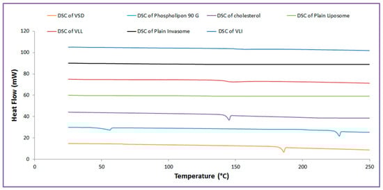 As shown in Figure 1, VSD, phospholipid, and cholesterol showed endothermic peaks at 186 °C, 224 °C, and 144.46 °C, respectively. The DSC thermogram of plain liposome, plain invasomes, VLI, and VLL shows the disappearance of the endothermic peaks.