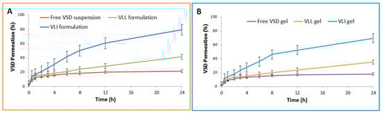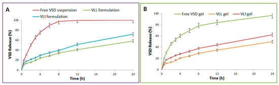 (A) In vitro release profiles of free VSD suspension and VLI and VLL formulations. (B) In vitro release profiles of free VSD and VLI and VLL gel formulations.