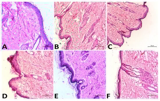 Compared to the group treated with oral VSD, the number and diameter of papillomas of the group treated with the VLI gel were significantly (p < 0.05) decreased. To confirm these results, the histopathology of each treatment was studied. The presence of neoplastic proliferative epithelial cells was seen histopathologically in the positive control group (Figure 5B) with dermal edema, hyperkeratosis, and inflammatory cell infiltrations. In the group treated with the free VSD gel, there was no improvement in the symptoms of skin toxicity in the dermis or epidermal layers (Figure 5C). The presence of hyperkeratosis in the epidermis was seen histopathologically in the group treated with oral VSD (Figure 5D) with dermal edema and diffused inflammatory reaction. A marked reduction in the hyperplasia and keratosis was seen histopathologically in the group treated with the VLL gel (Figure 5E), with a marked improvement in the size and number of papillomas. The group treated with the VLI gel (Figure 5F) showed excellent effects on the different skin layers, with the absence of all signs of skin toxicity. Skin papillomas were revealed, and hyperplasia and hyperkeratosis were absent.