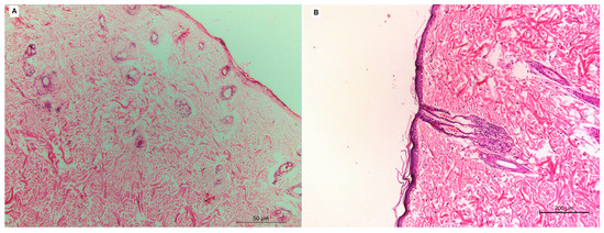 The histopathology of the group treated with the VLI gel (Figure 6B) was studied and compared with that of the negative control group (Figure 6A). There was not any inflammatory cell infiltration observed in the dermal layers of the group treated with the VLI gel, showing nearly normal skin similar to that of the negative control group.