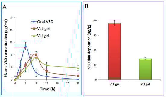VSD concentration in plasma (A) and skin (B) after administration of oral VSD, VLI gel, and VLL gel.