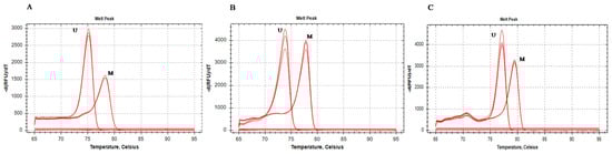 Raw melt curves (in triplicates) for 100% methylated (M) and 0% methylated (UM) bisulfite treated DNA standards. (A) DMR106540, (B) DMR24332, (C) DMR17107. Melt curve peaks had characteristically different shapes indicating that the methylated (M) and unmethylated (U) DNA are different products.