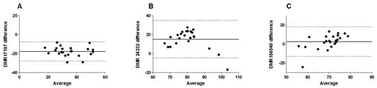 Nonparametric percentile method of Bland-Altman analysis. In the Bland–Altman plots shown above, the Y axis represents the difference between the measurements using the two methods and the X axis represents the average value of these measurements for (A) DMR17105, (B) DMR24332 and (C) DMR106540. The solid line represents the median of differences between measurements of the two methods and estimates of the systemic bias between the methods. The upper and the lower dashed lines represent limits of agreement (defined as the mean difference ± 1.96 SD of the difference between the two methods) between which 95% of measurements are situated.