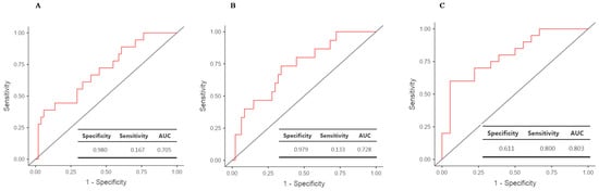 Logistic regression analyses were performed to estimate AUC and percentages of GRs and NRs correctly classified with the three DMRs and using three definitions of Li response: Alda-based broad definition (GR vs. NR/PaR—model 1, n = 70), Algo-based GR vs. others (model 2, n = 63) and Alda-based strict definition (GR vs. NR—model 3, n = 38) (Table 1). Clinical characteristics of all the samples identified as GR, PaR and NR according to the Alda scale are shown in Supplementary Table S2. Receiver operating characteristics (ROC) curves are presented in Figure 3. The lowest AUC (0.70 95% CI (0.57–0.84), p = 0.004) was obtained for the Alda-based broad definition (GR > 8 and NR < 8) with 98% of NR and 16.7% of GR being correctly classified. The performance of model 2 (Algo-based) was slightly improved (AUC = 0.73 95% CI (0.59–0.87), p = 0.002), with 97.9% of NR and 13.3% of GR being correctly classified. (Figure 3B). For the most stringent Alda-based definition of Li response (GR > 8 and NR < 3), the AUC was 0.80 95% CI (0.66–0.94) (p = 0.00002). This model correctly classified 80.0% of NR and 61.1% of GR, however with a reduction of the sample size since it did not take into account partial responders (Figure 3C).