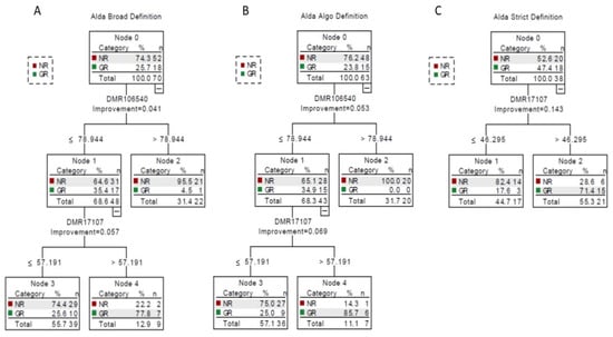 Classification tree models for Li response phenotypes (NR = nonresponse; GR = good response) and candidate DMRs. (A) Using model 1 (Alda-based broad definition), (B) model 2 (Algo-based definition), (C) model 3 (Alda-based narrow definition).