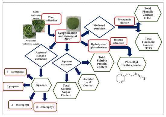Freeze-dried edible and non-edible watercress samples were macerated by utilizing different extraction protocols depending on the chemical nature of the examined phytochemical (Figure 1).