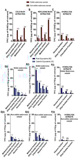 TPC and TFC profiles of both edible and non-edible watercress samples upon extraction with either refluxing or cold MeOH and subsequent fractionation with either MeOH or ethyl acetate or chloroform or hexane. TPC of each sample was quantified upon extraction with either (A) cold MeOH or (B) refluxing MeOH, whereas (C) represents the quantification of TPC from the hydrolysis of GLs in each sample. Data were expressed as gallic acid equivalents (GAE)/g of extract. On the other hand, TFC was quantified upon extraction of edible (D(i),E(i)) and non-edible (D(ii),(E(ii)) watercress samples with either refluxing or cold MeOH, respectively, whereas (F(i),F(ii)) represent the quantification of TFC from the hydrolysis of GLs in each sample, respectively. Data were expressed as rutin and catechin equivalents (RE and CE), respectively. All data are expressed as means ± SEM and are representative of three independent experiments. Statistical significance was set at * p < 0.05, ** p < 0.01, *** p < 0.001 upon one-way ANOVA analysis with Tukey’s test for multiple comparisons.