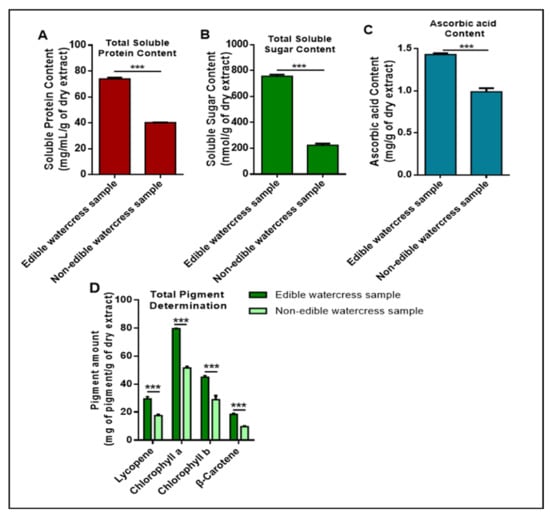 Next, by performing aqueous extraction, we were able to detect and quantify the total content of soluble proteins and sugars, as well as ascorbic acid in edible and non-edible watercress samples (Figure 3A–C), respectively.