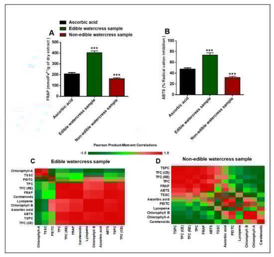 Cell-free antioxidant activity levels in both edible and non–edible watercress samples, as determined by the (A) FRAP and (B) ABTS assay kits. Ascorbic acid (at 1 mg/mL) was used as a reference standard. Data are expressed as means ± SEM and are representative of three independent experiments. Statistical significance is indicated by *** p < 0.001 upon one-way ANOVA analysis with Tukey’s test for multiple comparison. Additionally, Pearson’s correlation analysis was determined between major nutrients and phytochemical compounds with antioxidant activity levels in both edible (C) and non-edible (D) watercress samples. Red indicates a positive correlation (+1.0), whereas bright and dark green denote no correlation or negative correlation (−1.0), respectively.