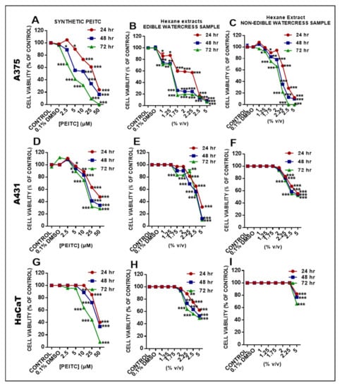 Moreover, we evaluated the anticancer potency of both watercress samples in an in vitro model of human malignant melanoma consisting of primary malignant melanoma (A375) (Figure 5A–C), non-melanoma epidermoid carcinoma (A431) (Figure 5D–F) and non-tumorigenic keratinocyte (HaCaT) (Figure 5G–I) cells. Overall, it was demonstrated that treatment with the edible watercress sample significantly decreased the viability levels of A375 cells in a concentration- and time-dependent manner. Specifically, the EC50 value at 48 h appears to be much lower than the respective EC50 value at 24 h, and at the same level as that at 72 h. This pattern was found to be of the same order but of a different magnitude when compared to those of non-edible watercress samples and synthetic PEITC (Table 3). For the evaluation of the cytotoxic potency of the lipophilic extract (obtained from both edible and non-edible watercress samples), our data were expressed as follows. First, results were expressed as % v/v in order to demonstrate the cytotoxic effect of the whole fraction, including its different components. Second, in order to compare the cytotoxic potency of the synthetic PEITC with the PEITC content of the hexane fraction, the viability results were presented as the μM concentration of PEITC in the hexane fraction. Thus, the EC50 of the PEITC in the hexane fraction was estimated based on the total PEITC found in that fraction in both edible and non-edible watercress samples.